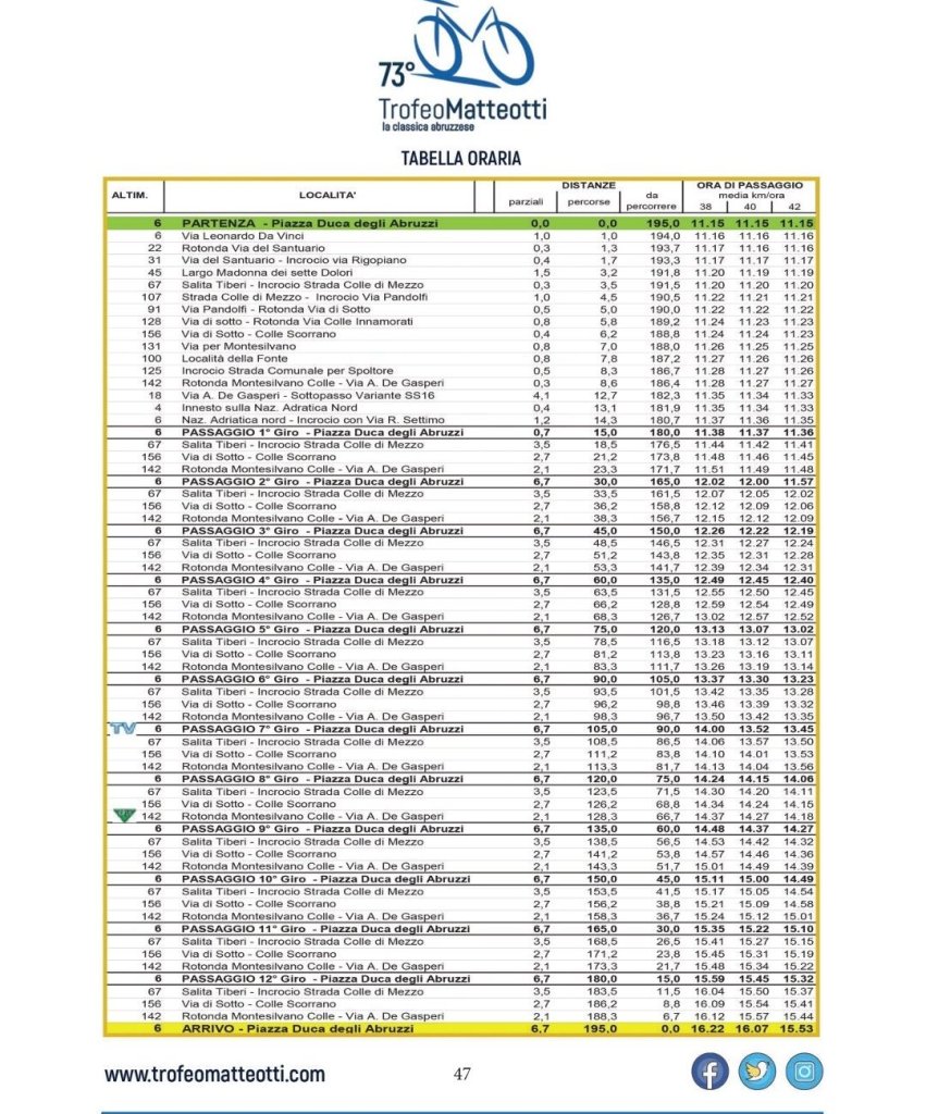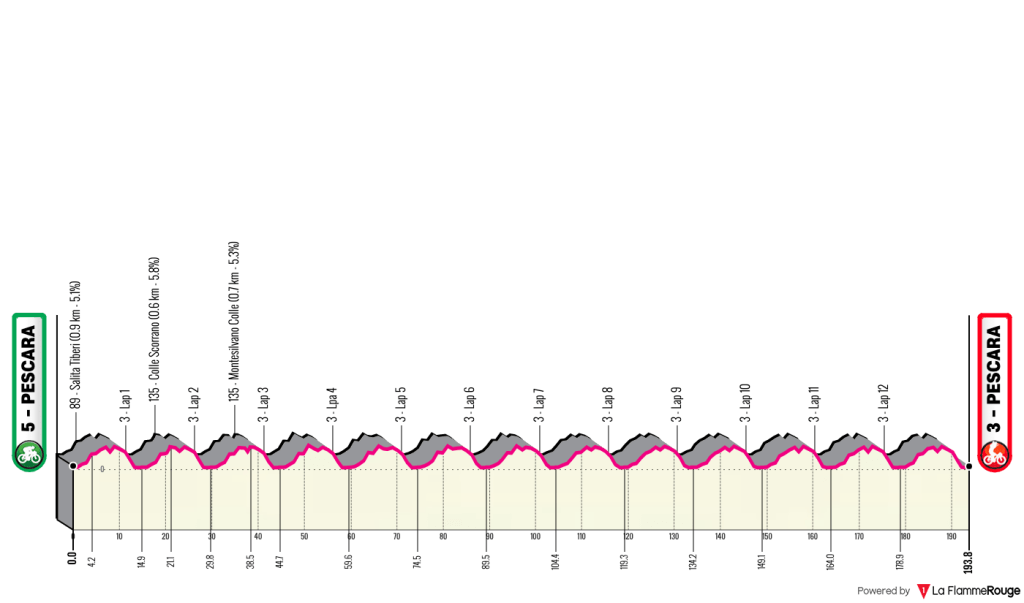 Es un recorrido de ‘sube y baja’, con los repechos del Largo Madonna dei Sette Dolori dentro de la ciudad y las pequeñas cotas de Colle Scorrano y Montesilvano. La última de las mismas, con un enrevesado y peligroso descenso por delante, se corona a 6 km de la llegada.