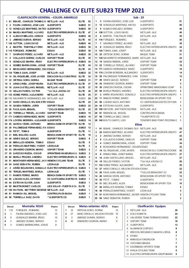 Tras la disputa del II Trofeo Camp de Morvedre, la Challenge de la Comunitat Valenciana está liderada en élites por Charlie Beake (Netllar – Ale), mientras que José Luis Faura (ULB Sports) es segundo y mejor sub23. Wilson Steven Haro (Essax) y Gorka Ortega mandan en las metas volantes y Romaric Forques (Essax) en la montaña y el Netllar Alé es la mejor escuadra.