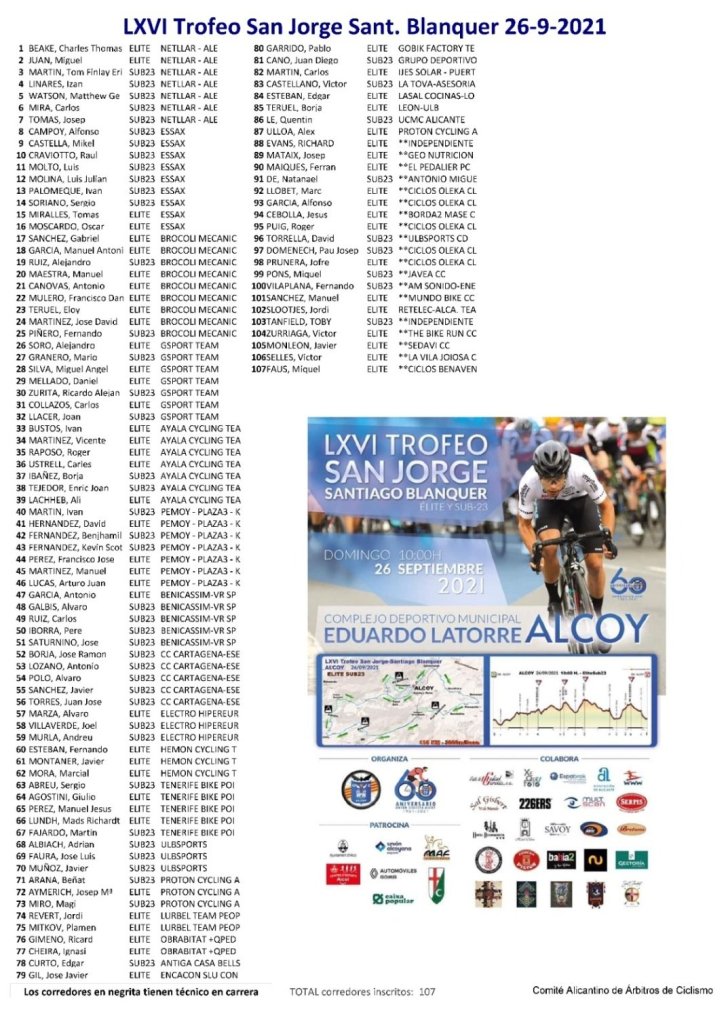 El LXVI Trofeo San Jorge – Memorial Santiago Blanquer cerrará la Challenge autonómica élite y sub 23. La clásica alcoyana se disputará el domingo, 26 de septiembre. El recorrido es de 106 kilómetros y cuenta con un desnivel de 1.480 metros. En el camino los puertos de la Buitrera, Canalís, Revoltes y Benifallim.