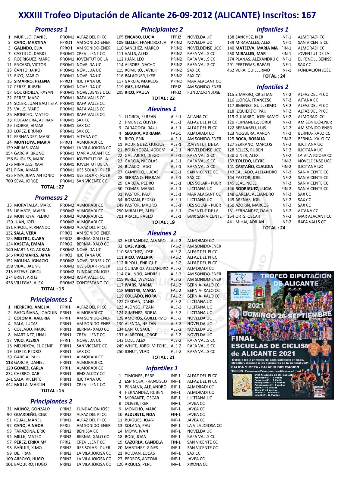 La prueba pone el punto y final a la Challenge Escuelas de Ciclismo de la provincia, está organizada por la Federación de Ciclismo de la Comunidad Valenciana y cuenta con el respaldo y la colaboración de la institución alicantina. Las secciones que participarán en la actividad son promesas (hasta 8 años), principiantes (9 y 10 años), alevines (11 y 12 años) e infantiles (13 y 14 años).