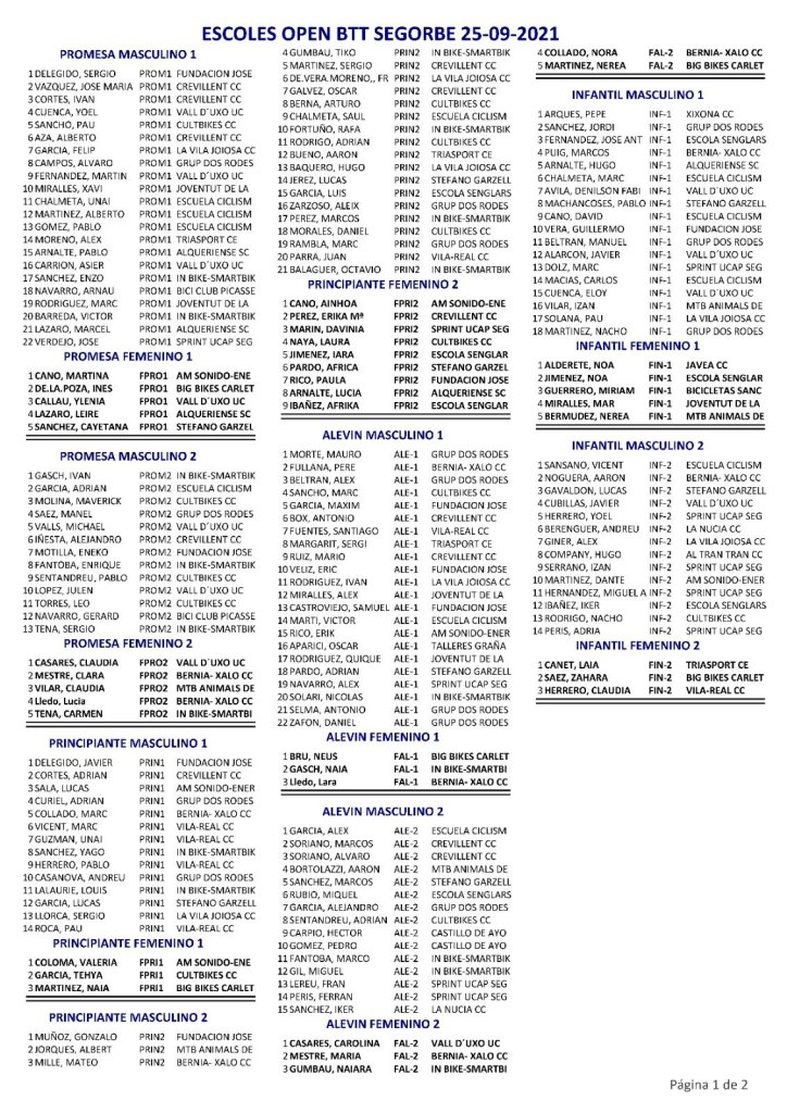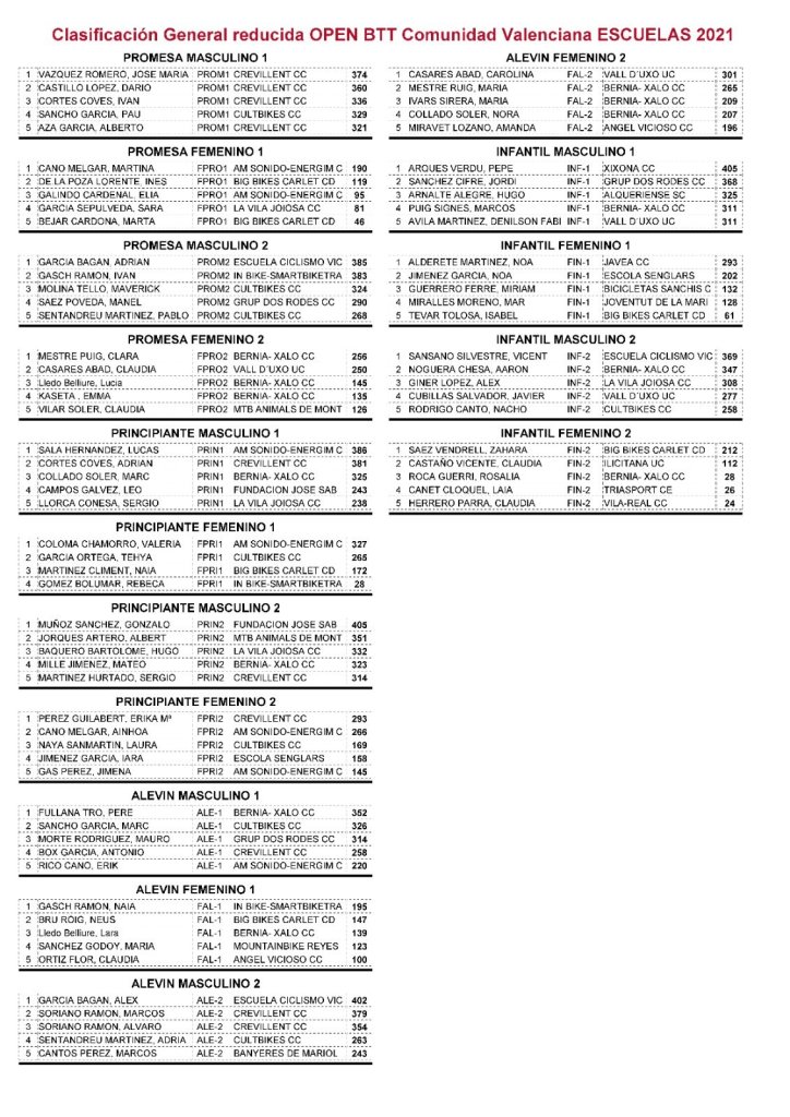 Tras la disputa de nueve pruebas los campeones del Open de la Comunitat son: José María Vázquez (CC Crevillent) y Martina Cano (AM Sonido), en Promesas 1; Adrián García (Víctor Cabedo) y Clara Mestre (Bernia Xaló), en Promesas 2; Lucas Sala (AM Sonido) y Valeria Coloma (AM Sonido), en Principiantes 1; Gonzalo Muñoz (Fundación Sabater) y Erika María Pérez (Crevillent), en Principiantes 2; Pere Fullana (Bernia Xaló) y Naia Gasch (In Bike), en Alevines 1; Álex García (Víctor Cabedo) y Carolina Casares (Vall d’Uixo), en Alevines 2; Pepe Arqués (Xixona) y Noa Alderete (Jávea), en Infantiles 1; y Vicent Sansano (Víctor Cabedo) y Zahara Sáez (Big Bikes), en Infantiles 2.