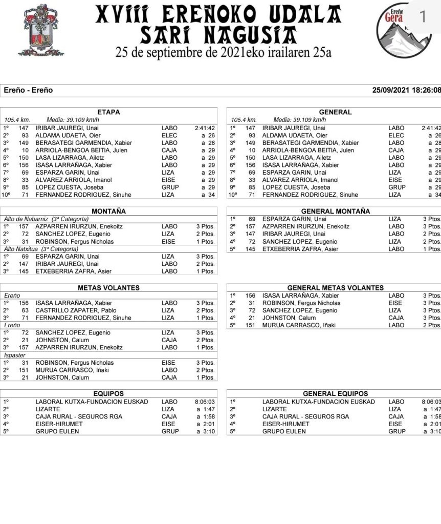 Unai Iribar (Laboral Kutxa) se ha impuesto hoy en la XVIII Ereño Udala Sari Nagusia que ha puesto el punto y final al Torneo Helduz que aquí ya llegaba sentenciado en favor de su compañero Xabier Isasa.