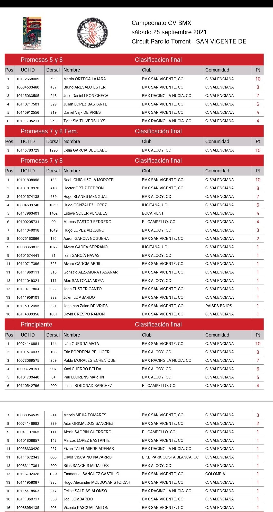 En cadetes femenina, Cristina O’Shea (BMX San Vicente) logró el título; Paula Santonja (BMX Alcoy), en Principiantes femeninas; Belén Calvo (El Campello), en Alevín féminas; Marc Killian (Bike Park Costa Blanca), en Máster 30; Samuel Santos (BMX San Vicente), en Hombres 30 a 39; y Daniela Rubio (BMX San Vicente), en Mujeres 40 a 49.