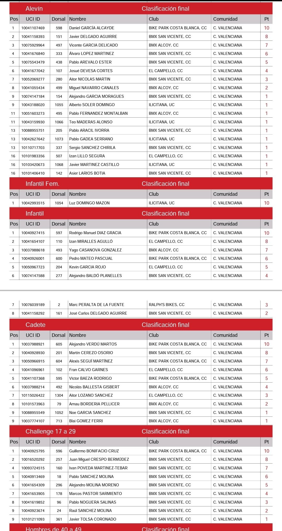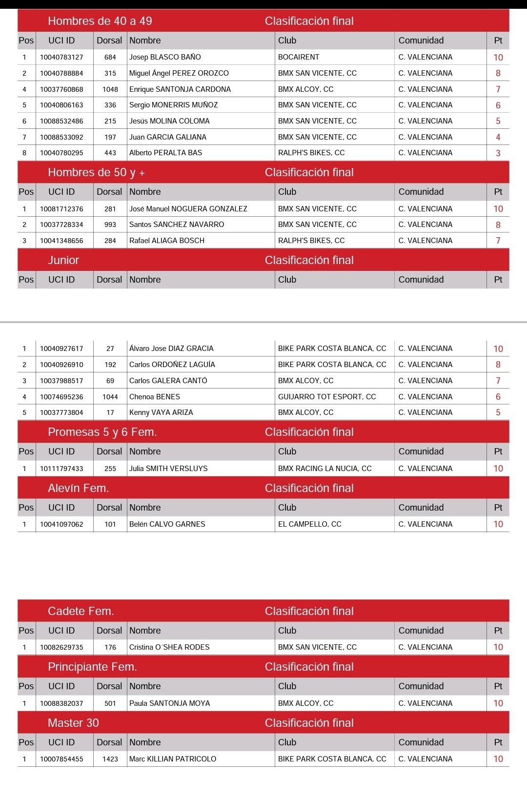 En Hombres de 40 a 49, Josep Blasco (Bocairent) superó a Miguel Ángel Pérez (BMX San Vicente) y a Enrique Santonja (BMX Alcoy). En Hombres 50 y más, José Manuel Noguera (BMX San Vicente) terminó primero, con Santos Sánchez (BMX San Vicente) y Rafael Aliaga (Ralph’s Bikes), a continuación.