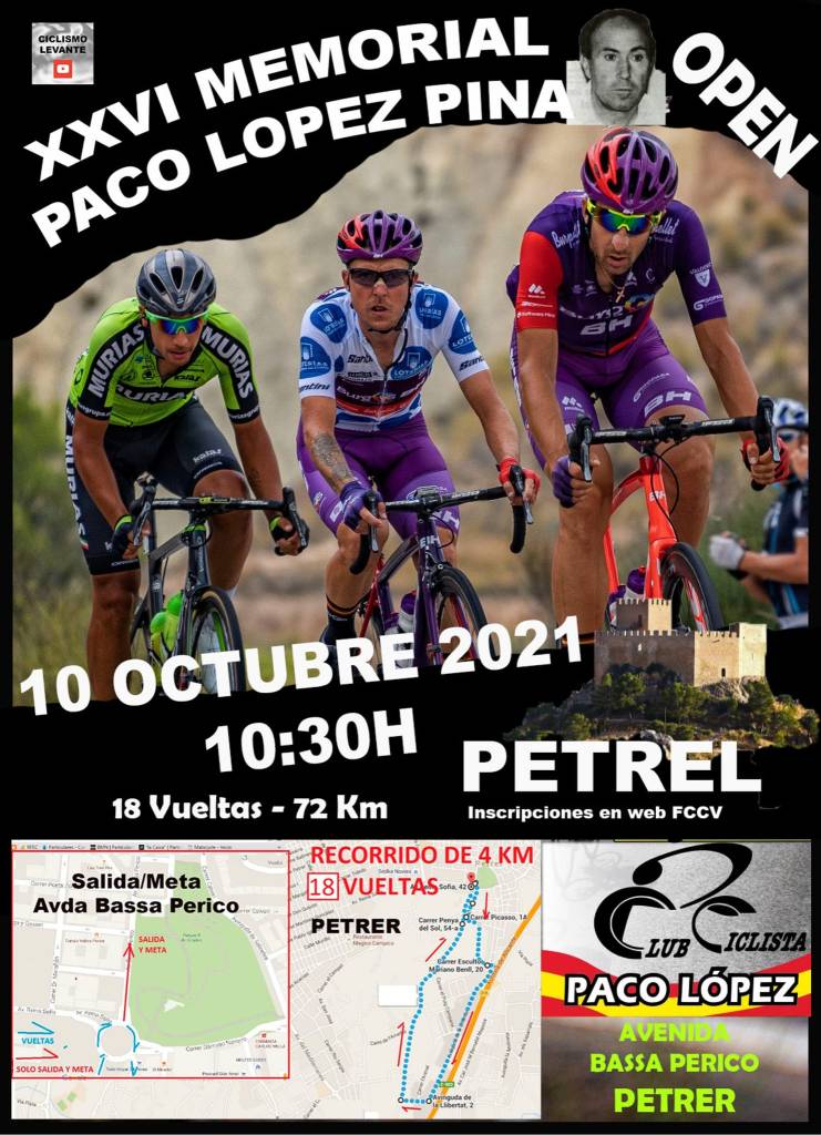 El domingo, 10 de octubre, a partir de las 10.30 horas, Petrel acogerá el XXVI Memorial Paco López Pina que está reservado a las categorías Sub23 Fem., Sub23, Master 60 Fem., Master 60, Master 50 Fem., Master 50, Master 40 Fem., Master 40, Master 30 Fem., Master 30, Junior Fem., Junior, Elite Fem. y Elite. El Club Ciclista Paco López ha diseñado un circuito de cuatro kilómetros, con salida y meta en la avenida Bassa Perico, al que será darán 18 vueltas, hasta completar los 72 kilómetros. Se espera una gran participación. Las inscripciones están abiertas en la FCCV.