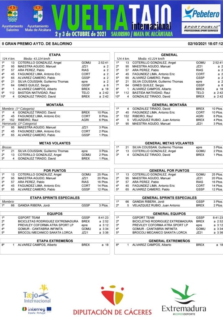 Ángel Coterillo (Gomur-Cantabria Infinita) se ha impuesto hoy en el GP Ayuntamiento de Salorino, primera etapa de la II Vuelta al Tajo Internacional y se ha vestido de líder. Coterillo fue el más rápido de los ocho ciclistas que han llegado a meta. Su tiempo ha sido de dos horas, 52 minutos y 41 segundos. Manuel Maestra (JZ21) ha sido segundo y Pablo Ara (Rías Baixas), tercero