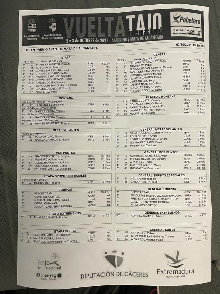 Benjamí Prades (Vigo-Rías Baixas) se ha impuesto hoy en el II GP Ayuntamiento de Mata de Alcántara, segunda jornada de la IIVuelta al Tajo Internacional, que ha conquistado Ángel Coterillo (Gomur-Cantabria Infinita). Josué Gómez (Gsport) ha sido tercero en la etapa final disputada hoy y su equipo el mejor de las dos jornadas.