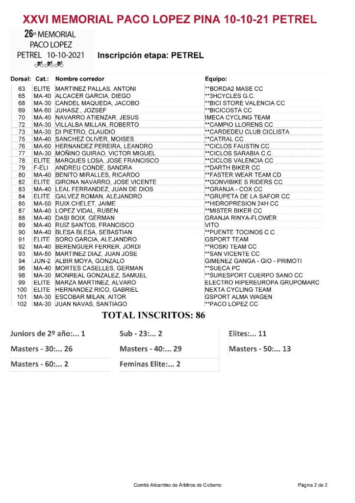 El domingo, 10 de octubre, a partir de las 10.30 horas, Petrel acogerá el XXVI Memorial Paco López Pina. El Club Ciclista Paco López ha diseñado un circuito de cuatro kilómetros, con salida y meta en la avenida Bassa Perico, al que será darán 18 vueltas, hasta completar los 72 kilómetros. Tomarán la salida 86 corredores: Once élites masculinos, dos élites femeninas, dos sub 23, un júnior de primer año, 26 M30, 29 M40, 13 M50 y dos M60