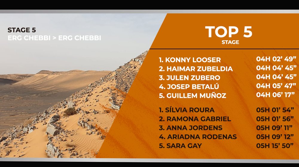 El paso de dunas de Erg Chebbi del kilómetro 15 al 20, un clásico de esta carrera, lo pasaba ya con el grupo delantero, aunque ahí era Josep Betalú el que lideraba la prueba con cuatro minutos de ventaja respecto al resto. Un error del ciclista del KH7 hacía que Guillem Muñoz y Óscar Valdepeñas aparecieran primeros en la primera estación de hidratación. Muñoz, segundo en la clasificación, se veía con opciones de recortar la ventaja con Looser y conseguir el maillot rojo, pero tampoco acertaba al elegir el trazado ideal.