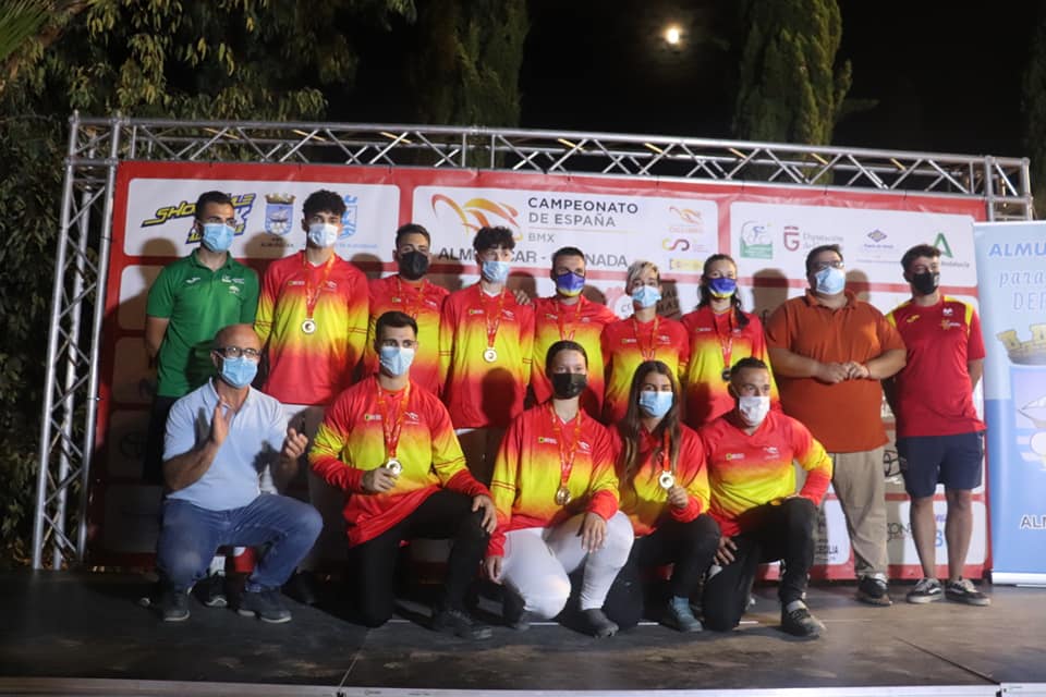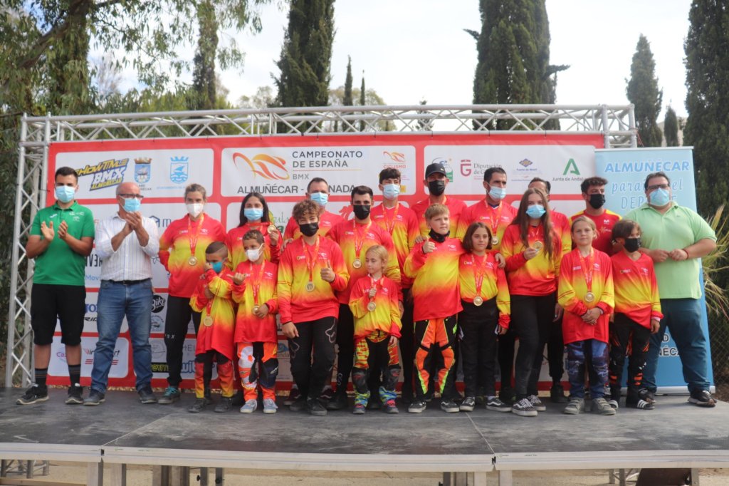 Los riders del Bmx San Vicente Martín Ortega (Promesas 5 y 6), Miguel Ángel Pérez (M40), Rodrigo Ridao (40 a 49) y José Noguera (M50) han logrado el título en el Campeonato de España de BMX Racing que se ha disputado este fin de semana en el circuito de la Playa de El Pozuelo de Almúñecar, que por segundo año consecutivo ha reunido a los grandes especialistas del panorama nacional. Consiguieron la medalla de plata Pablo Sánchez (BMX San Vicente-Challenge 17-19), Santos Sánchez (BMX San Vicente-M50), Álvaro José Díaz (Bike Park Costa Blanca-Júnior), Marc Killian (Bike Park Cost Blanca-M30), Carlos Galera (BMX Alcoy) y Paula Santonja (Bmx Alcoy-Principiantes Femenino). También subieron al podio, como terceros clasificados, Guillermo Bonifacio (Bike Park Costa Blanca-Challenge 17 a 29), Hugo Muñoz (Bike Park Costa Blanca-Promesas 7 y 8), Chiara Muñoz (Bike Park Costa Blanca-Alevín Femenino), Izán Miralles (BM Campello-Cruiser 13-16), Pep Blasco (Bocairent-40 a 49 Cruiser) y Yago Casanova (BMX Alcoy-Infantil). En lo que respecta a la clasificaciones por comunidades, la victoria fue para la de Madrid, por delante de Cataluña y de la Comunitat Valenciana.