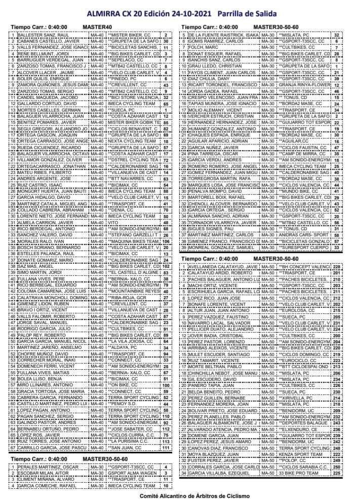En Máster 30, triunfos para Carolina Juárez (Mister Biker) y Aitor Escobar (Gsport); en M40, Sabrina Cerdá (BH Concept) y Javier Cabanes (Grupeta de la Safor) han sido los mejores; en M50, han vencido Roser Vidal (Biking Turia) y Juan Moya (Kenza Sport) terminan los primeros; y en M60, Abelardo Martínez (Velo Club) ha sido el mejor.