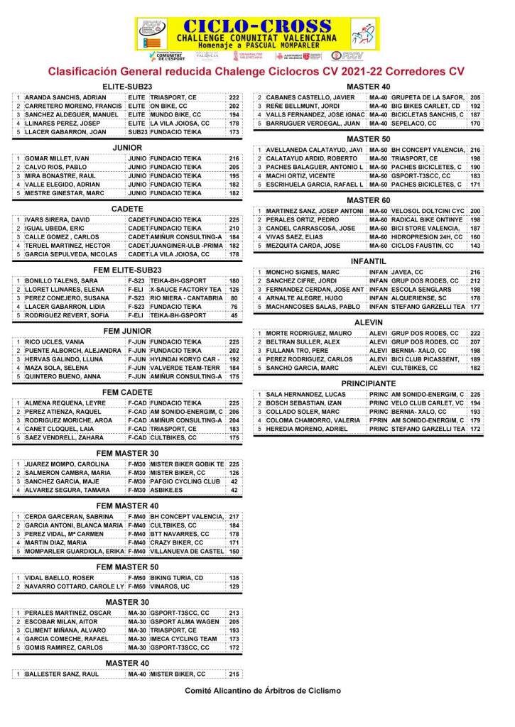 En Máster 30 lideran su clasificación Carolina Juárez (Mister Biker) y Óscar Perales (Gsport); Sabrina Cerdá (BH Concept) y Raúl Ballester (Mister Biker), en M40; Roser Vidal (Biking Turia) y Javier Avellaneda (BH Concept), en M50; y Josep Antonio Martínez (Velosol), en M60.