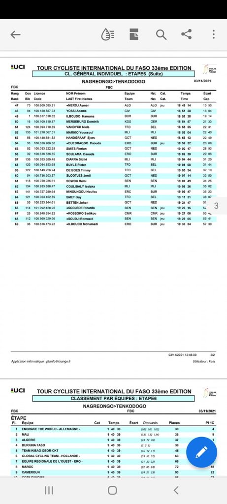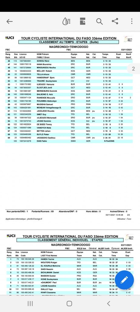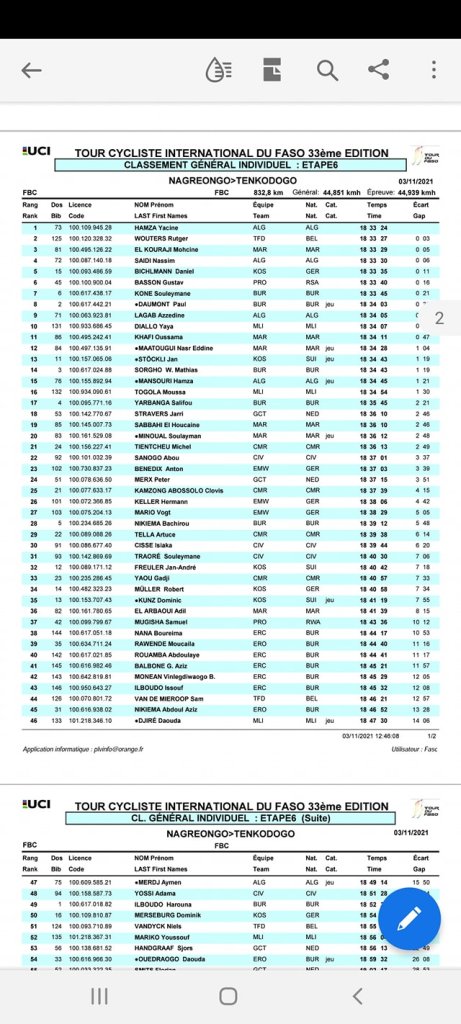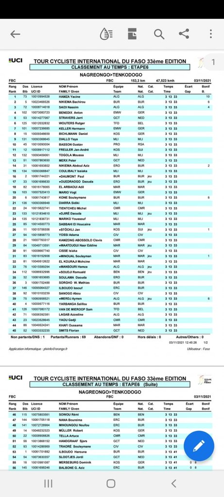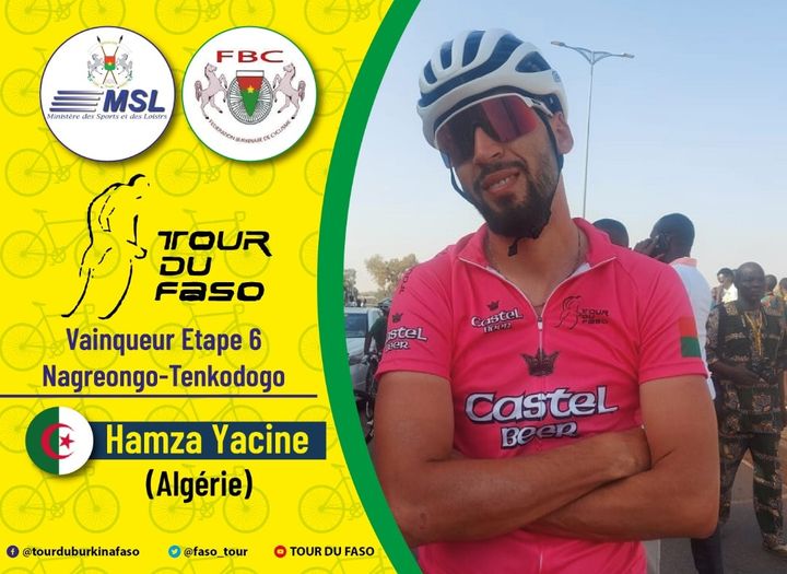 El argelino Hamza Yacine se ha impuesto en la sexta etapa del Tour Faso 2021 que ha unido Nagreongo y Tenkodogo, después de 153,3 kilómetros de recorrido. El tiempo del ganador ha sido de tres horas, 13 minutos y 33 segundos. Bassirou Nikièma ha conseguido un segundo puesto y Saidi Nassim el tercero. Yacine es el nuevo líder de la carrera. El jueves se disputa la séptima etapa, una contrarreloj por equipos de 33 kilómetros entre Koupéla y Zorgho.