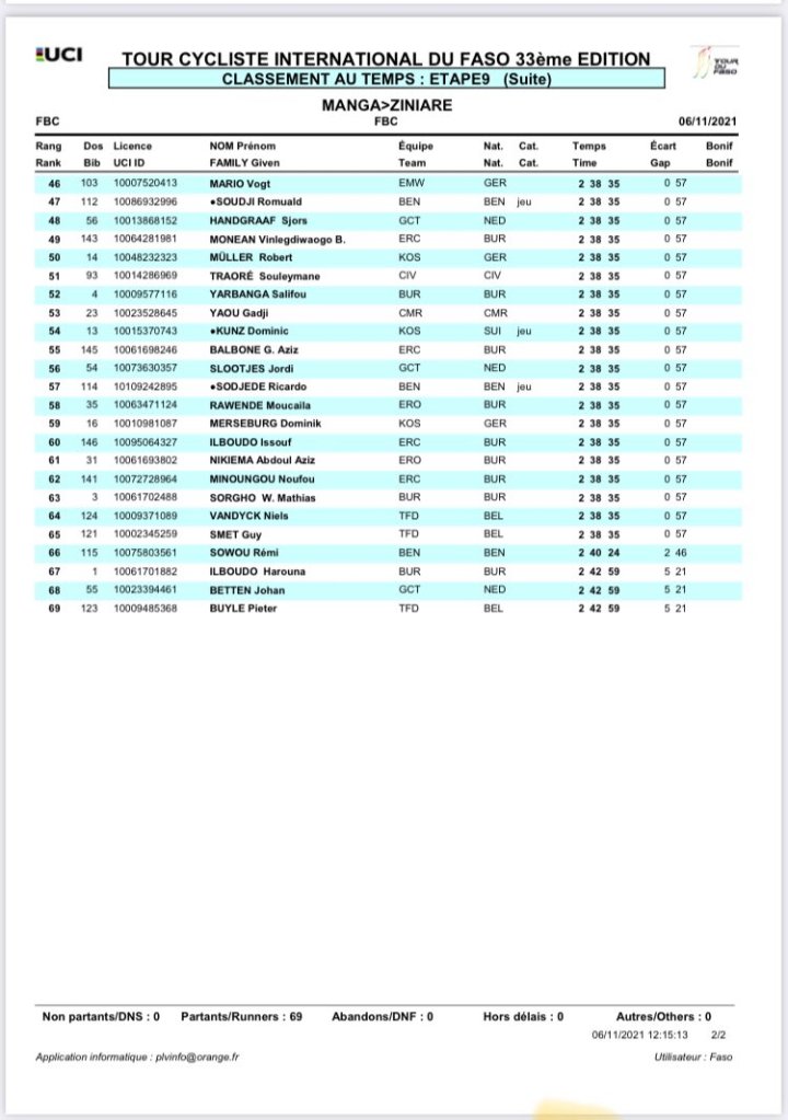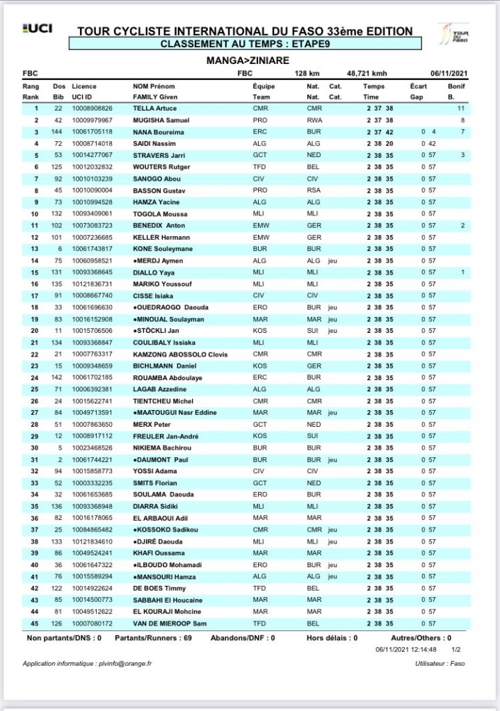Artuce Tella (Camerún) ganó la novena y penúltima etapa del Tour du Faso este sábado en Ziniaré. Tella entró por delante de sus compañeros de fuga Samuel Mugisha (ProTouch) y Boureima Nana (Centro) y el pelotón cruzó la línea a 57 ». En vísperas de la etapa final, el alemán Daniel Bichlmann (Team KIBAG-OBOR-CKT) se mantiene en lo más alto de la clasificación general con 33 » de ventaja sobre Oussama Khafi (Marruecos) y 36 » de Azzedine Lagab (Argelia). La décima jornada del Tour du Faso llevará al pelotón de Kombissiri a Uagadugú, tras 129,5 kilómetros de recorrido.