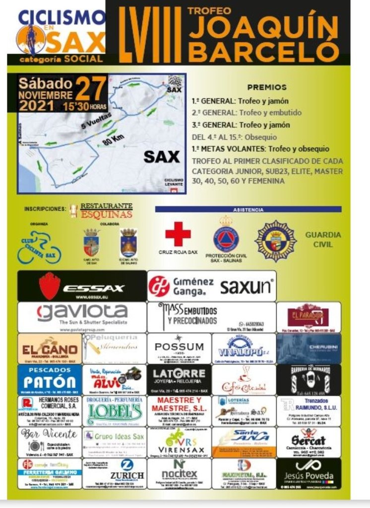 El Club Ciclista Sax informa que ya están abiertas A TRAVÉS DE ESTE ENLACE las inscripciones para el 58º Trofeo Joaquin Barcelo en Sax. La prueba, de 80 kilómetros de recorrido, se disputará el sábado 27 de noviembre a partir de las 15.30 horas.