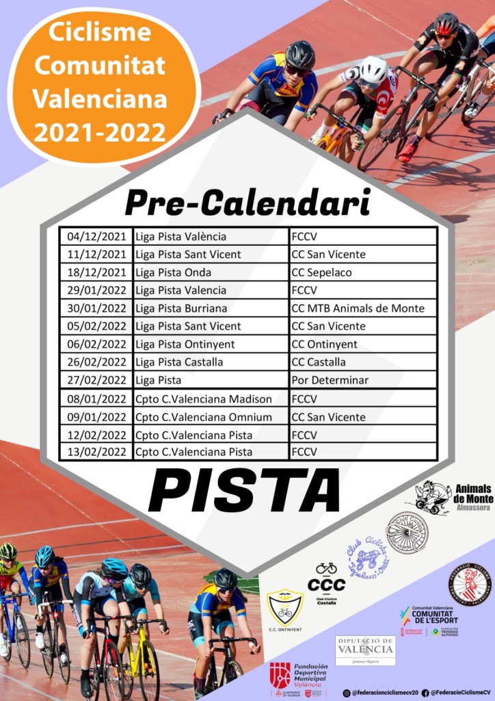 Los velódromos de San Vicente del Raspeig y Castalla acogerán tres pruebas de la Liga de Pista de la Comunitat Valenciana durante la temporada 2021-2022. La FCCV ha hecho público el precalendario de competiciones de la Liga de Pista y de los campeonatos autonómicos. La primera constará de un total de nueve citas y arrancará el 4 de diciembre en el velódromo Luis Puig de València. Además, San Vicente del Raspeig (11 de diciembre y 5 de febrero), Onda (18 de diciembre), València (29 de enero), Burriana (30 de enero), Ontinyent (6 de febrero), Castalla (26 de febrero) y otra ciudad todavía sin determinar el 27 de febrero albergarán las competiciones.
