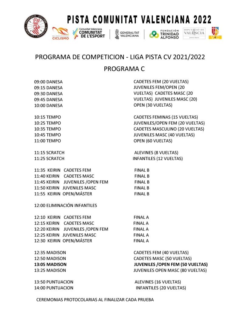 La Federación de Ciclismo de la Comunidad Valenciana (FCCV) informa que ya están abiertas A TRAVÉS DE ESTE ENLACE las inscripciones para la primera prueba de Liga de Pista que se disputará el sábado, 4 de diciembre, en el Velódromo Luis Puig de València. La competición comenzará a las nueve de la mañana.