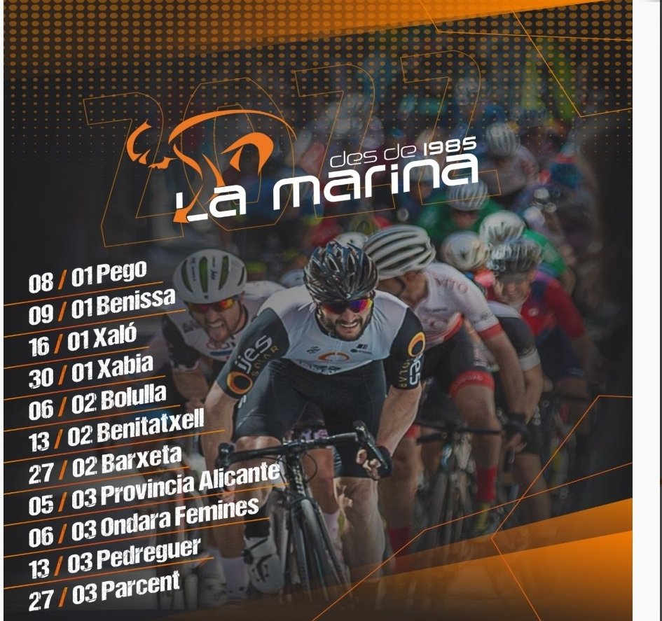 La Volta La Marina 2022 comenzará el día 8 de enero en Pego. La competición contará con otras pruebas ya fijadas según el calendario que ha diseñado la organización. El 9 de enero se correrá en Benissa; el 16, en Xaló; el 30, en Xàbia; los días 6, 13 y 27 de febrero en Bolulla, Benitatxell y Barxeta, respectivamente; y en Pedreguer y Parcent, los día 13 y el 27 de marzo. La Vuelta Ciclista Féminas Ajuntament D’Ondara se correrá el 6 de marzo.