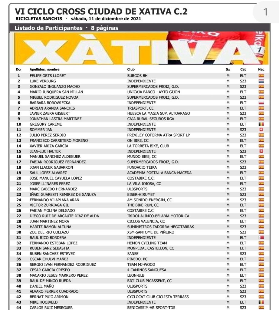 El polideportivo Les Pereres acogerá el sábado la VI Ciclocross Internacional «Ciutat de Xàtiva», que contará con las categorías Internacional C2 Élite, sub-23, junior y también cadete y máster. Entre los inscritos figuras los actuales campeones de España Felipe Orts, Lucía González y Sara Bonillo (sub-23).