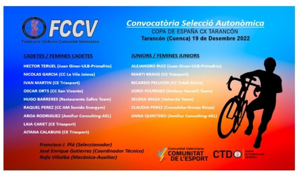 El seleccionador autonómico de ciclocross, Paco Pla, ha convocado a 16 ciclistas cadetes y juniors para participar, este próximo domingo 19 de diciembre, en el Ciclocross Internacional Ciudad de Tarancón, última prueba puntuable para la Copa de España. La participación en la cita conquense servirá para preparar el Campeonato de España que se disputará en Xàtiva entre los días 7 y 9 de enero de 2022.