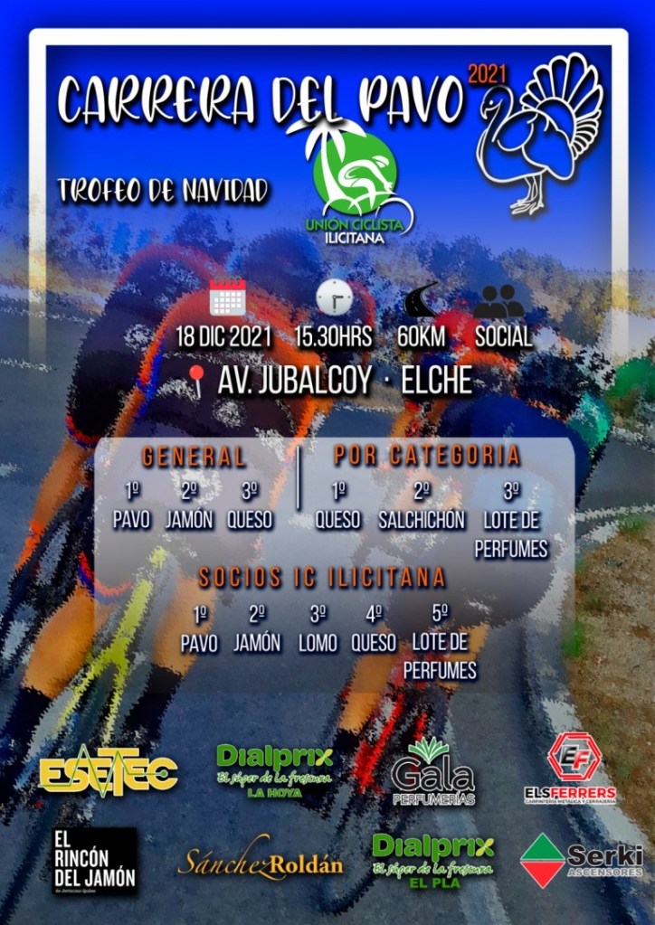 El sábado, día 18 de diciembre, a partir de las 15.30 horas, se disputa la tradicional Carrera del Pavo de Elche-Trofeo Navidad con la presencia de 106 corredores entre los que destaca el ciclista profesional murciano, Antonio Jesús Soto, que milita desde la temporada 2019 en el equipo Continental UCI Fundación Euskadi. Tanto el arranque como la meta estarán situadas en el número 12 de la Avenida de Juvalcoy y el pelotón deberán recorrer 60 kilómetros. Se darán 16 vueltas a un circuito de 3,7 kilómetros. La prueba stá reservada a las categorías Sub23 Fem., Sub23, Máster 60 Fem., Máster 60, Máster 50 Fem., Máster 50, Máster 40 Fem., Máster 40, Máster 30 Fem., Máster 30, Júnior Fem., Júnior, Élite Fem. y Élite.