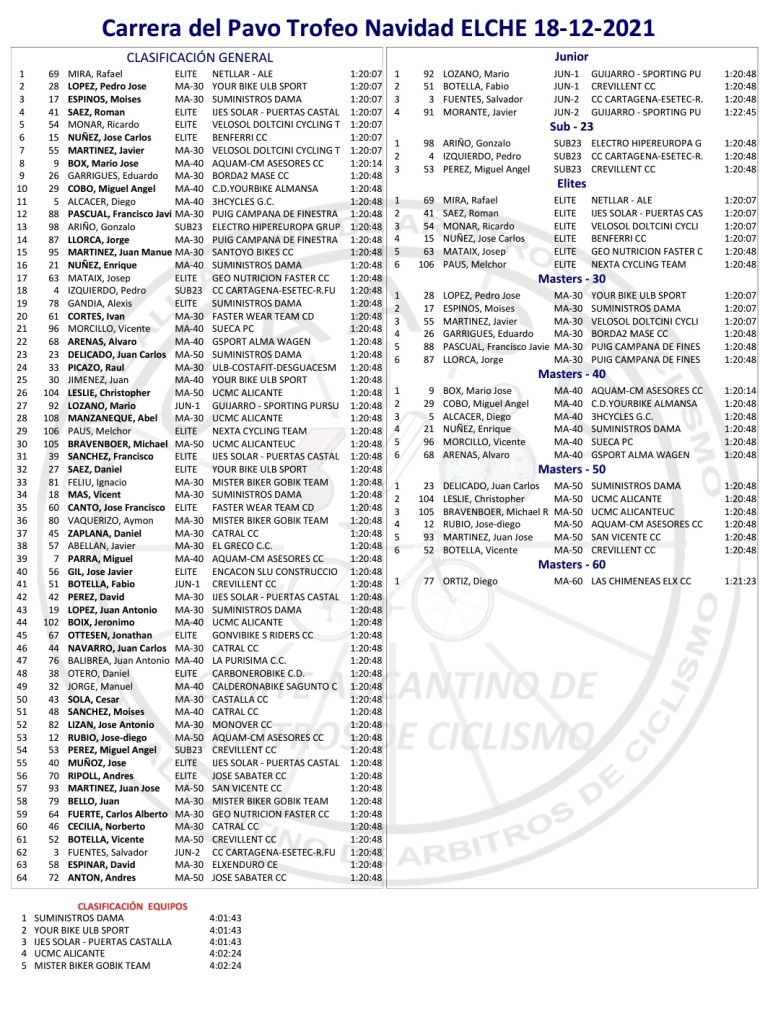 El Suministros Dama ha sido el mejor equipo; Mario Lozano (Guijarro), se ha impuesto en la clasificación de los júniors: Gonzalo Ariño (Electro Hiper Europa), en la de los sub 23; Rafael Mira, en la de los élites; Pedro José López ha sido el primer M30; Mario José Box (Aquan) gana en los M40; y Diego Ortiz (Las Chimeneas Elx), entre los M60.