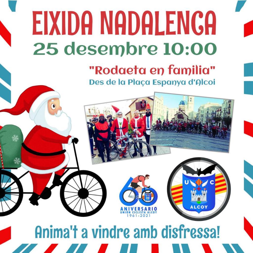La «Eixida Nadalenca», que organiza la Unión Ciclista Alcoy (UCA) desde 2017, se celebrará el sábado, día 25 de diciembre, y no el 24 como en principio estaba previsto. Es una salida en bicicleta familiar a la cual no es preciso apuntarse, “simplemente acudiendo a la plaza de España a las 10 de la mañana con las bicis es suficiente”, afirma Sergio Cortés, presidente de la UCA. Desde la entidad alcoyana se anima a la gente “venir disfrazados con motivos navideños”. Se realizará una vuelta por Alcoy con escolta policial para la seguridad de los participantes y la «rodaeta en familia» está recomendada para todos los públicos.
