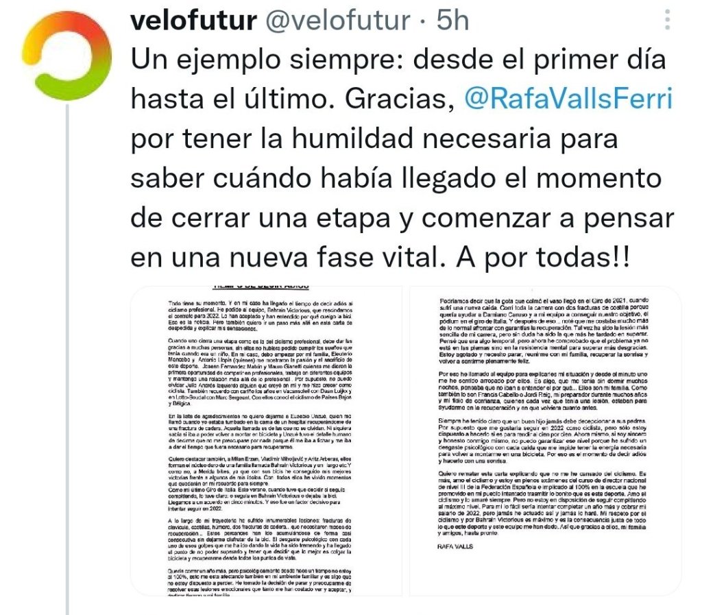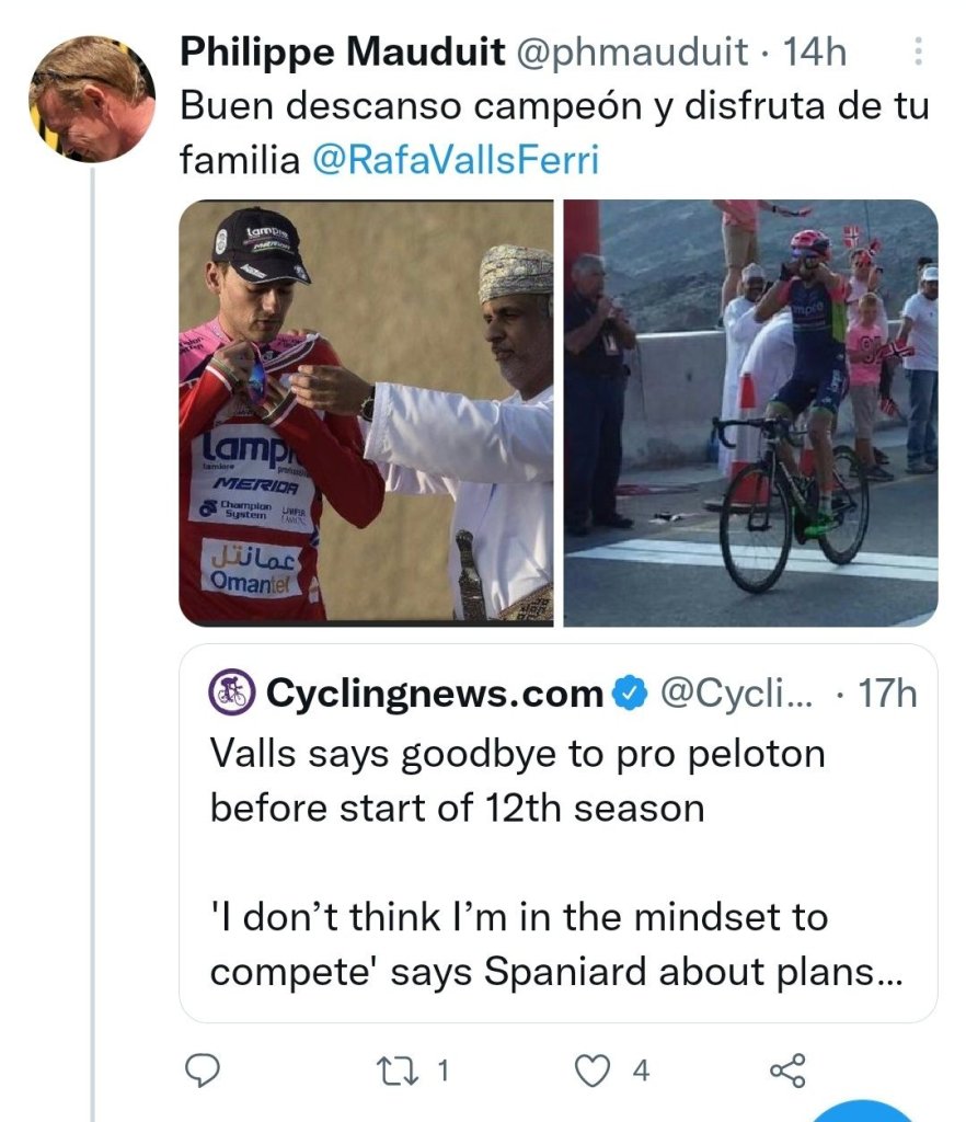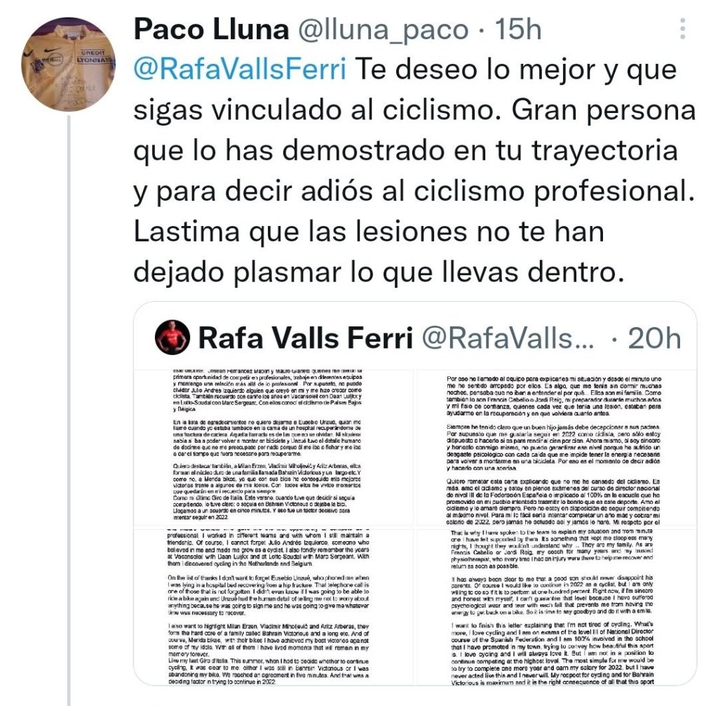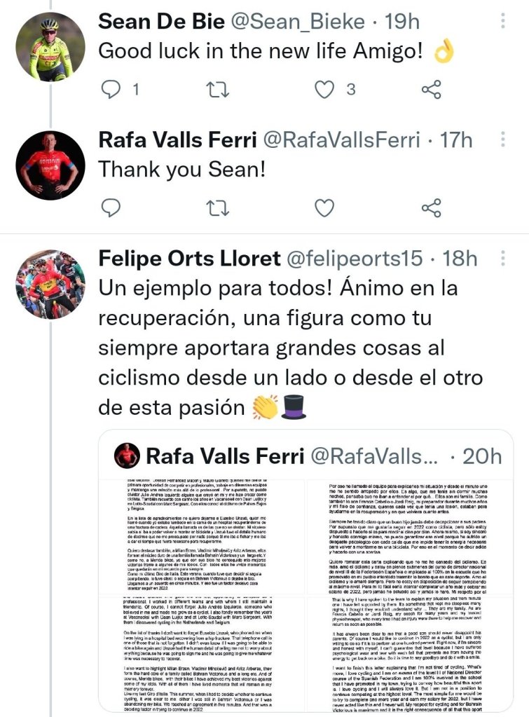 El día después de anunciar su retirada del ciclismo profesional ha resultado muy emotivo para Rafa Valls, que ha podido darse cuenta que era un hombre muy querido en el pelotón y que su forma de ser en la día a día y su manera de moverse en el pelotón han dejado huella. Las redes sociales han destacado toda su trayectoria a pesar de que las caídas y lesiones no le hayan dejado mostrar el palmarés que debía tener a tenor de su nivel ciclista. Su télefono no ha parado de sonar y su Whastsapp está lleno de mensajes.