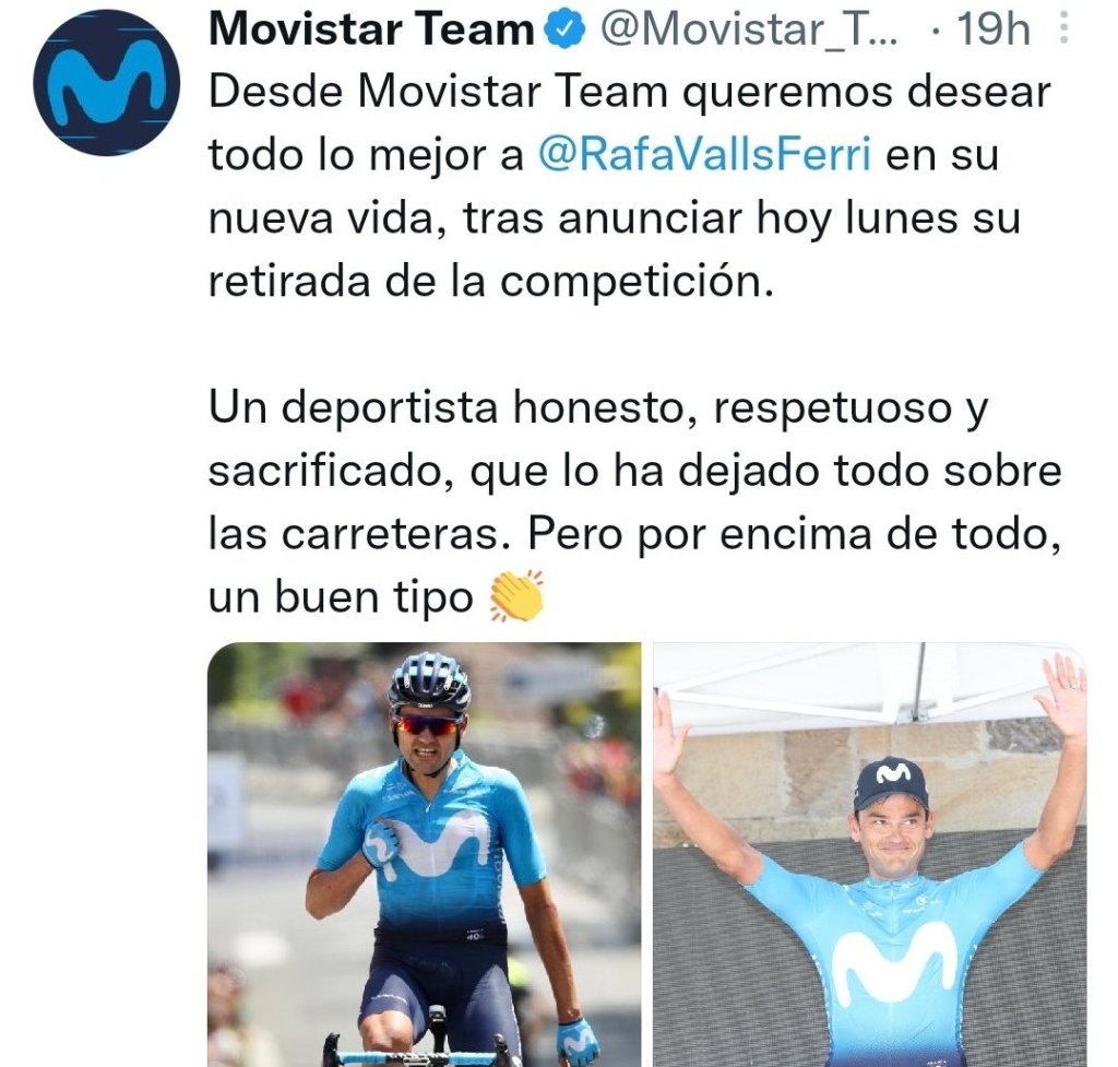 Desde Movistar Team, uno de sus equipos, hasta Felipe Orts, pasando por infinidad de excompañeros, gente de ciclismo… han aprovechado para desearle lo mejor en esta andadura y reconocerle la huella deja tras los años que ha estado como profesional. Todos destacan su honestidad y como bien explica Movistar Team en su Twitter su calidad humana: “Por encima de todo, un buen tipo”.