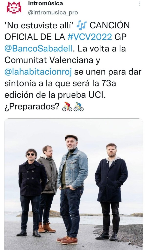 La Volta a la Comunitat Valenciana–GP Banco Sabadell y el grupo La Habitación Roja se unen un año más para dar sintonía a la que será la 73a edición de la prueba UCI. “No estuviste allí” forma parte de “Años luz II”, nuevo álbum del grupo valenciano. Pura electricidad, una canción de lo más guitarrera que no dejaremos de escuchar al ver al pelotón rodar por Valencia, Alicante y Castellón del 2 al 6 de febrero.