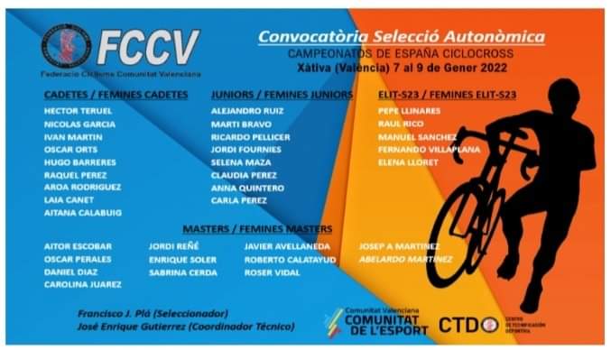 La convocatoria esta formada por los cadetes Héctor Teruel, Nicolás García, Iván Ma Crtín, Óscar Orts y Hugo Barreres; las cadetes Raquel Pérez, Aroa Rodríguez, Laia Canet y Aitana Calabuig; los juniors Alejandro Ruiz, Martí Bravo, Ricardo Pellicer y Jordi Fournies; las juniors Selena Maza, Claudia Pérez, Carla Pérez y Anna Quintero; los élite Pepe Llinares, Raúl Rico, Manuel Sánchez; la élite Elena Lloret; el sub23 Fernando Vilaplana; y los másters Aitor Escobar, Óscar Perales, Dany Díaz, Carolina Juárez, Jordi Reñé, Enrique Soler, Sabrina Cerdà, Javier Avellaneda, Roberto Calatayud, Roser Vidal, Josep Antoni Martínez y Abelardo Martínez.