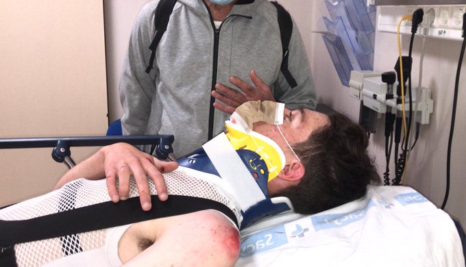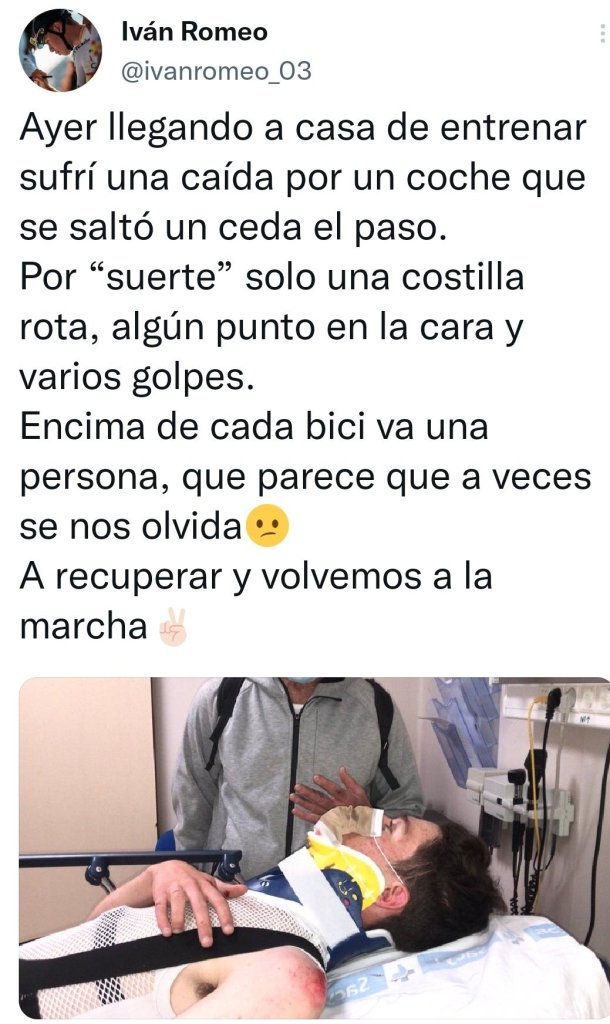 El corredor vallisoletano relataba así lo sucedido a través de su cuenta de Twitter. «Ayer llegando a casa de entrenar sufrí una caída por un coche que se saltó un ceda el paso. Por ‘suerte’ solo una costilla rota, algún punto en la cara y varios golpes. Encima de cada bici va una persona, que parece que a veces se nos olvida. A recuperar y volvemos a la marcha. Estoy bien, en casa y disfrutando con la familia. Gracias por los mensajes y Felices Fiestas a tod@s», señaló, junto a una foto en la que aparecía en la cama de un hospital con collarín, un punto en la zona de la barbilla y una abrasión en su hombro izquierdo.