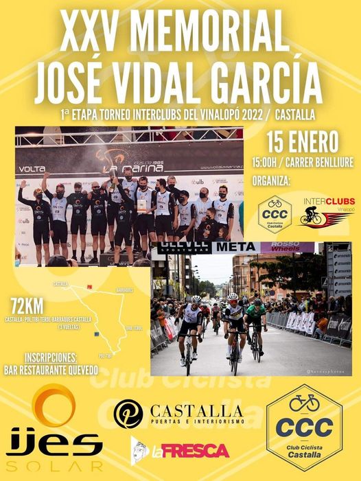 El Club Ciclista Castalla organizará el próximo 15 de enero, sábado, el XXV Memorial José Vidal García, a partir de las tres de la tarde, sobre un recorrido de 72 kilómetros. Se darán tres vueltas a este circuito: Castalla-Castalla Int.-Pol. Tibi-Terol-Barraques-Castalla. Un recorrido clásico, aunque con el sentido invertido, sin grandes dificultades y previsiblemente con llegada al esprint. Será la primera etapa del Torneo XIV Interclubs Vinalopó, por lo tanto, vestirá a su primer líder.