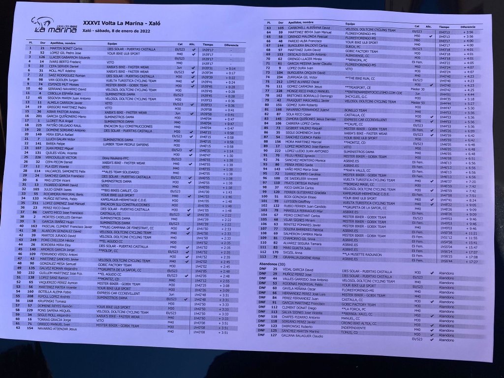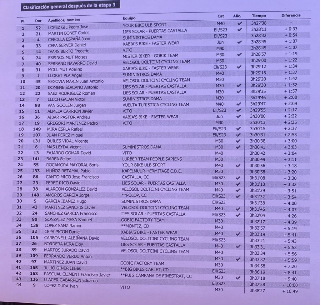 Tras la disputa de las tres primeras etapas, Pego, Benissa y Xaló, Pedro José López (Yourbike) sigue de líder; Mireia Orengo (Beniopa) es la primera en féminas; Dani Cepa (Infinobras), el mejor joven; Pablo Muñoz (Kapelmuur), lidera la Montaña; y Pedro José López, las Metas Volantes.