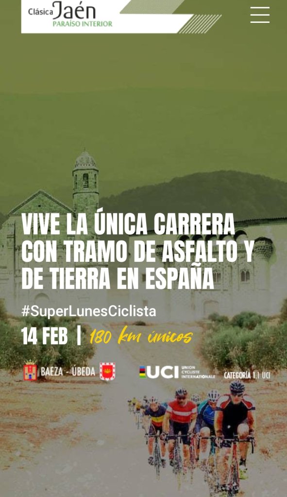 La Clásica ‘Jaén Paraíso Interior’ se disputará el próximo 14 de febrero y está organizada por la Diputación Provincial de Jaén y Unidad Editorial. Partirá de Baeza y finalizará en Úbeda. El actual seleccionador nacional, Pascual Momparler, es el director técnico de la carrera. Contará con un recorrido de 180 kilómetros en el que se combinarán tramos de carretera con caminos de tierra, el típico «sterrato» que tendrá más de 40 kilómetros. El recorrido tiene más de 3.500 metros de desnivel acumulado. El circuito final cuenta con una subida de seis kilómetros cuyo inicio, los cinco primeros, son todo de ‘sterrato’. Termina en el centro histórico de Úbeda.