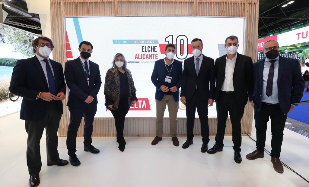 El presidente de la Diputación de Alicante, Carlos Mazón, ha presentado este jueves en la Feria Internacional del Turismo (FITUR) la etapa décima de la Vuelta Ciclista a España 2022, que será una contrarreloj de 31,1 kilómetros y que partirá de Elche y finalizará, el 30 de agosto, a las puertas del emblemático Palacio Provincial, coincidiendo con el 200 aniversario de la Diputación de Alicante. Este acontecimiento deportivo dejará un impacto de cerca de un millón de euros aproximadamente. Así lo ha dado a conocer el presidente de la Diputación alicantina en un acto en el stand de la Costa Blanca en Fitur, que se celebra esta semana en Madrid, junto al alcalde de Elche, Carlos González Serna; al concejal de Deportes ilicitano, Vicente Alberola ; la vicealcaldesa de Alicante, María Carmen Sánchez, y el director de Unipublic, Javier Guillén.