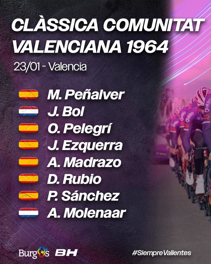 Manolo Peñalver, Alex Molenaar, Jesús Ezquerra, Ángel Madrazo, Diego Rubio, Pelayo Sánchez, Jetse Bol y Óscar Pelegrí disputarán el domingo la Clásica Comunitat Valenciana. El director deportivo Alexis Gandía remarca la «ilusión con la que afrontamos esta carrera, tras una buena pretemporada. Vamos con la ambición de ganar, de conseguir la victoria. Llevamos un equipo que se defiende bien en el terreno llano y en puerto no muy duros. Con experiencia y además con la posibilidad de meternos en la hipotética llegada masiva, con ciclistas rápidos y buenos lanzadores, y la clara apuesta por Manolo Peñalver que está en un gran momento.