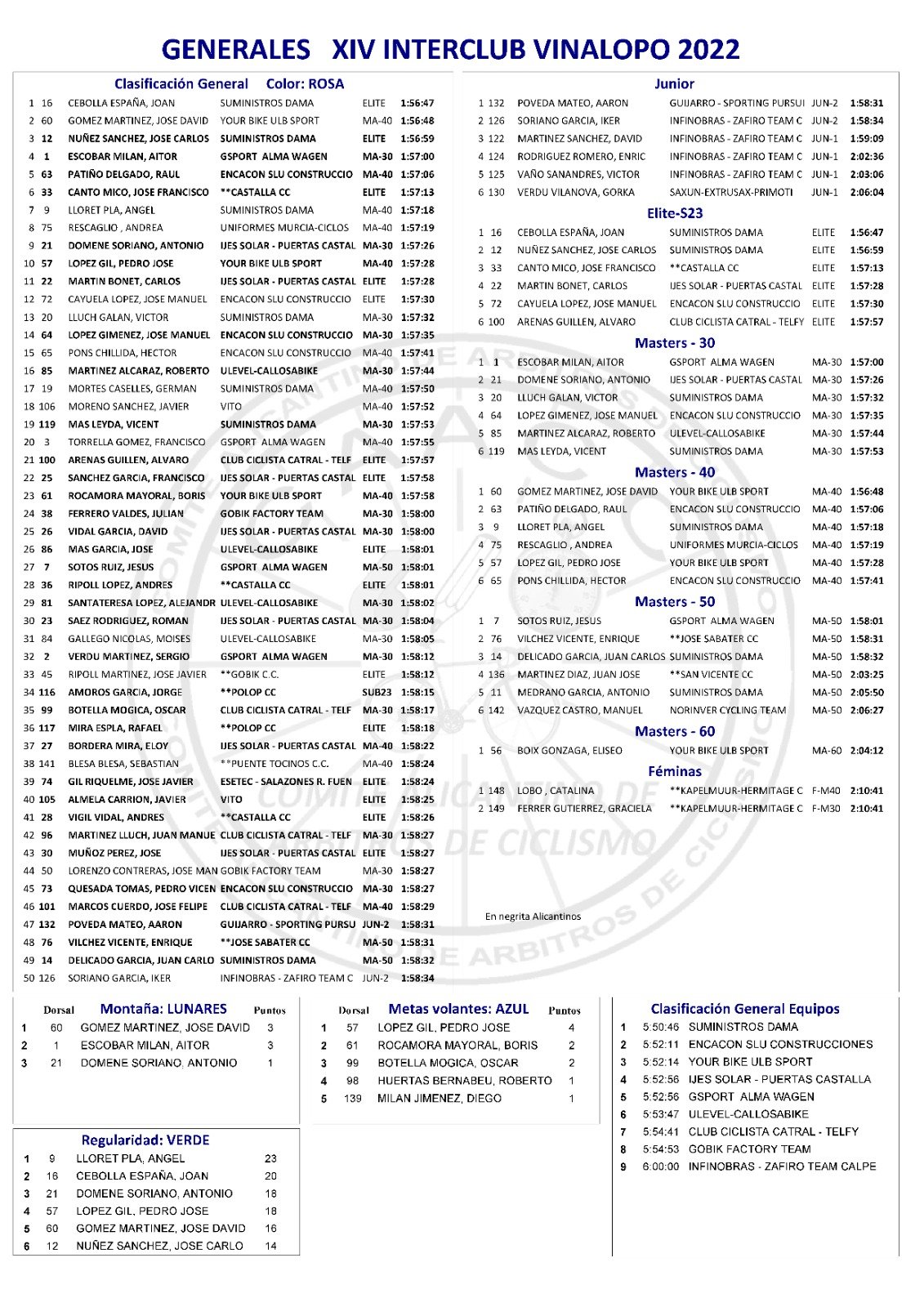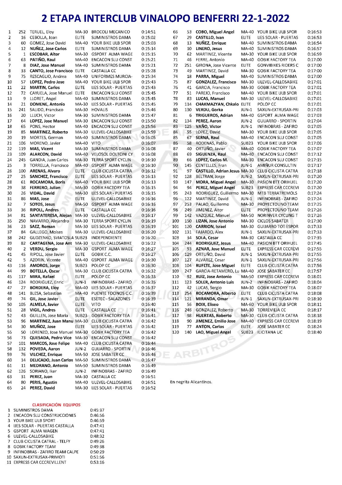 Tras la disputa de dos etapas, Joan Cebolla es el nuevo líder del Torneo XIV Interclubs Vinalopó, con sólo un segundo de ventaja sobre José David Gómez (Yourbike), que le sigue en la General, y José Carlos Núñez (Suministros Dama), que es tercero. Aitor Escobar (Gsport), es el mejor de la categoría Máster 30; José David Gómez, de los M40; Jesús Soto, comanda la clasificación de los M50; Eliseo Boix (Yourbike), la de los M60; y Aarón Poveda (Guijarro), la de los júniors. José David Gómez lleva el maillot de la Montaña; Pedro José López, el de las Metas Volantes; Ángel Lloret, el de la Regularidad; y el Suministros Dama es el mejor equipo.