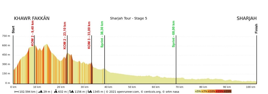 La última etapa se disputa el martes entre Khawr Fakkán y Sharjah, de 102,60 kilómetros de recorrido.