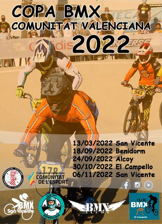 La Copa Comunitat Valenciana de BMX constará este año 2022 de cinco pruebas puntuables, todas ellas en la provincia de Alicante. La competición arrancará y finalizará en San Vicente del Raspeig los días 13 de marzo y 6 de noviembre respectivamente. El resto de competiciones se realizarán en Benidorm, Alcoy y El Campello.