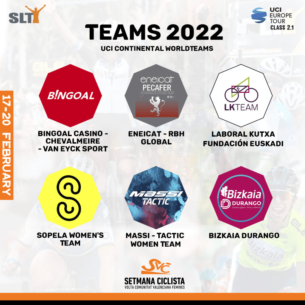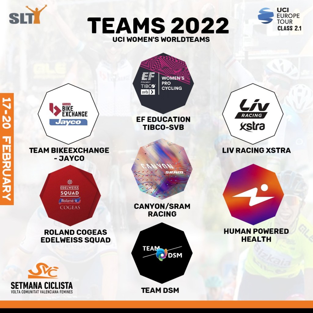 La prueba contará con 25 equipos. Estarán presentes los 13 equipos femeninos World Tour más potentes del planeta: Movistar, UAE, Jumbo-Visma, Canyon/Sram, Education First, Bike Exchange, Liv Racing, Roland Cogeas, Team DSM, Uno Women, Human Powered, Fdj y Trek Segafredo. También estarán Team Cofidis, Valcar Travel, Ceratizit WNT Pro Cycling, CAMS Racing, BePink y Le Col-Wahoo. Además de estos se encuentran las escuadras españolas UCI Continental Bizkaia-Durango, Sopela Womens Team, Laboral Kutxa, Massi-Tactic, Eneicat y la belga del Bingoal.