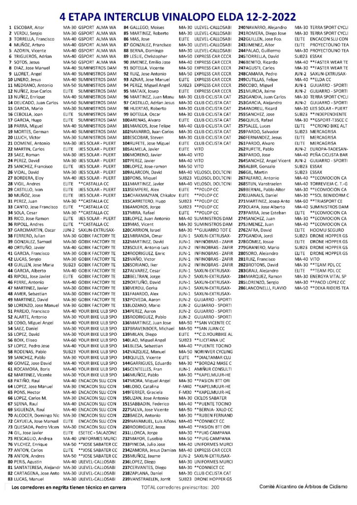 Tras la disputa de tres etapas Aitor Escobar es el líder del Interclubs, con 23 segundos de ventaja sobre José David Gómez (Yourbike), que le sigue en la General, y Joan Cebolla (Suministros Dama), tercero. Aitor Escobar (Gsport), es el mejor de la categoría Máster 30; José David Gómez, de los M40; Jesús Soto, comanda la clasificación de los M50; Eliseo Boix (Yourbike), la de los M60; y Aarón Poveda (Guijarro), la de los júniors. Aitor Escobar lleva los maillots de la Montaña y de la Regularidad; Pedro José López, el de las Metas Volantes; Ángel Lloret; y el Suministros Dama es el primer equipo.