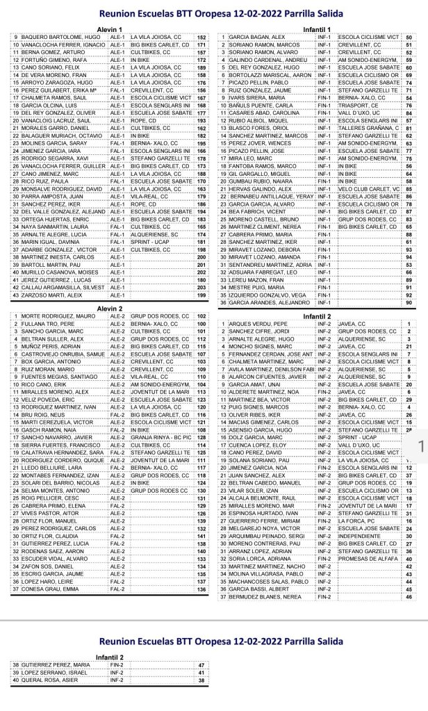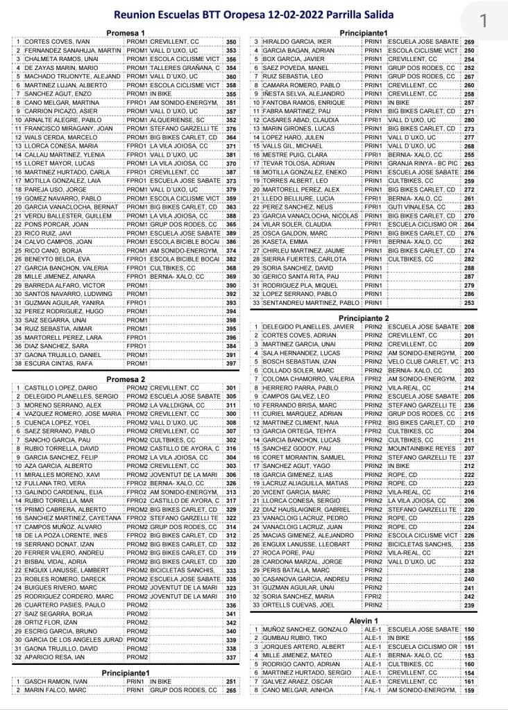Villar del Arzobispo acogió el pasado fin de semana la primera prueba del Open BTT de Escuelas de la Comunitat Valenciana. Estos fueron los gandores: Gorka Catalán (Izomendi) y Martina Cano (AM Sonido), en Promesas 1; Darío Castillo (Crevillent) y Vera Fullana (Bernia Xaló), en Promesas 2; Iván Gasch (In Bike) y Claudia Casares (Vall d´Uixo), en Principiantes 1; Javier Delegido (Fundación Sabater) y Valeria Coloma (AM Sonido), en Principiantes 2; Gonzalo Muñoz (Fundación Sabater) y Ainhoa Cano (AM Sonido), en Alevines 1; Mauro Morte (Grup Dos Rodes) y Neus Bru (Big Bikes Carlet), en Alevines 2; Álex García (Escole Ciclisme) y María Ivars (Bernia Xaló), en Infantiles 1; y Pepe Arqués (Jávea) y Noa Alderete (Jávea), en Infantiles 2.