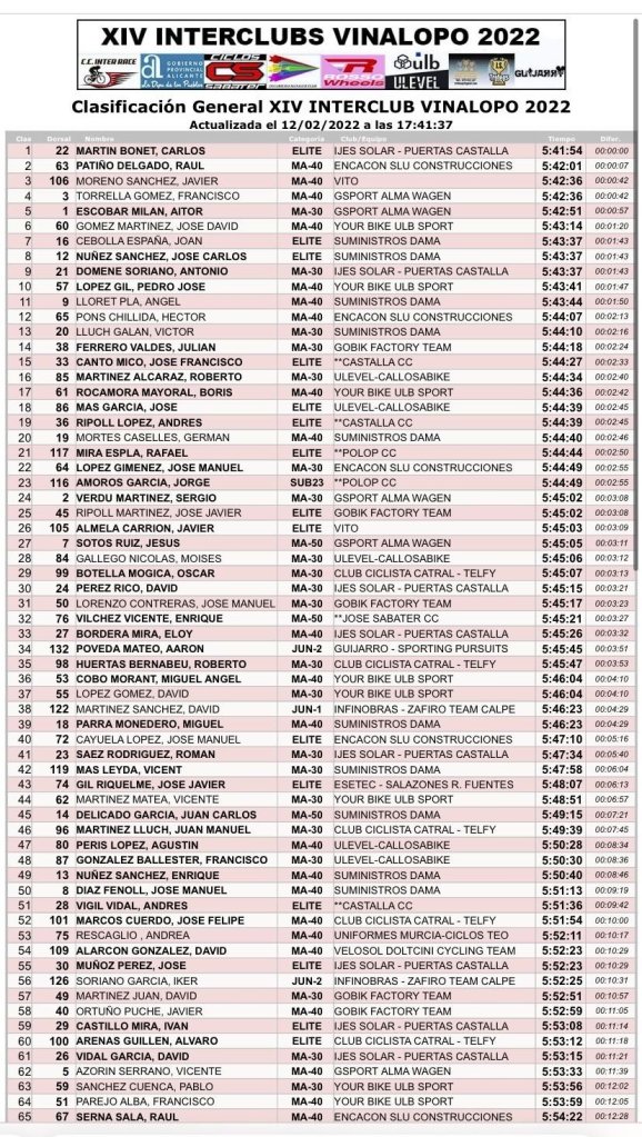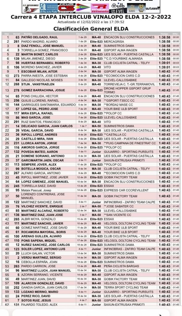 Tras la disputa de cuatro etapas Carlos Martín (Ijes Solar), en el nuevo líder del Interclubs, con siete segundos de ventaja sobre Raúl Patiño, que le sigue en la General, y Javier Moreno (Vito), tercero. Aitor Escobar (Gsport), es el mejor de la categoría Máster 30; Raúl Patiño, de los M40; Jesús Soto, comanda la clasificación de los M50; Eliseo Boix (Yourbike), la de los M60; y Aarón Poveda (Guijarro), la de los júniors.
