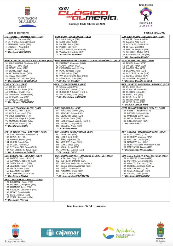Las lista de rivales con opciones es amplia. Giacomo Nizzolo (Israel-Premier Tech), portador del dorsal número uno, como vencedor hace ahora doce meses, tiene ante sí la posibilidad de igualar a su compatriota Massimo Strazzer, ganador en 1997 y 2002 y a Pascal Ackermann, baja de última hora y dominador en 2019 y 2020, como dominadores del palmarés de la prueba almeriense. A ellos se unen Nacer Bouhanni (Arkéa-Samsic), Alexander Kristoff (Intermarché-Wanty-Gobert), Niccolò Bonifazio (TotalEnergies) y, por supuesto, Matteo Trentin (UAE-Emirates), segundo ayer en la Vuelta a Murcia y que liderará, al menos en teoría, al intratable equipo de Joxean Fernández Matxin que, repitiendo el seis que ha dominado dominado en tierras murcianas, tratará de alargar un fin de semana de ensueño para ellos.