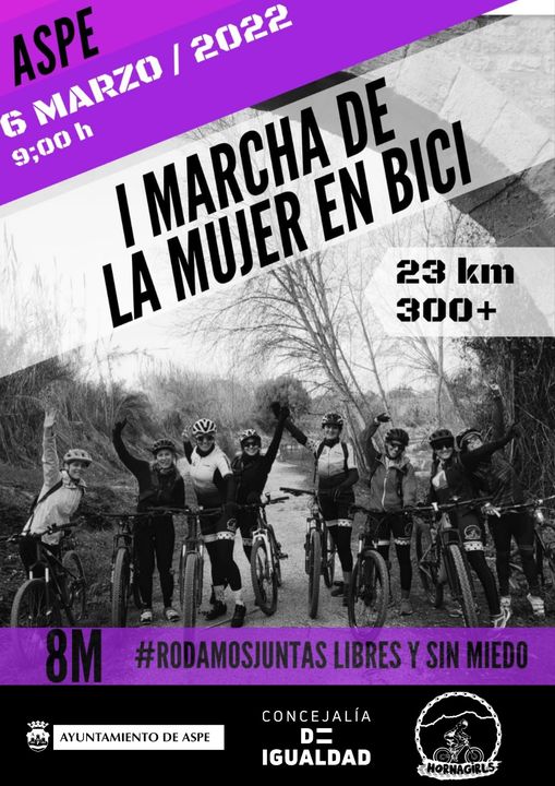 El grupo ciclista aspense de féminas denominado Hornagirls, en colaboración con la concejalía de Igualdad del Ayuntamiento de Aspe, organizan el próximo 6 de marzo, la I Marcha de la Mujer en Bici. La salida está prevista a las nueve de la mañana desde el Parque Dr. Calatayud y la organización pide a los participantes acudir 45 minutos antes al punto de encuentro.