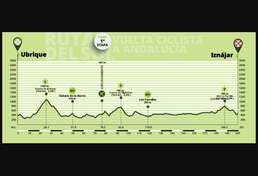 Primera etapa: Ubrique (Cádiz) – Iznájar (Córdoba). 200,7 kilómetros. Miércoles 16 de febrero. La primera será la jornada más larga de la 68ª Ruta del Sol. Una etapa de media montaña con cinco cotas y su llegada en cuesta, similar al final de 2020 en el que ganó Gonzalo Serrano, decidirá el primer maillot de líder.