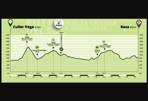 Cuarta etapa: Cúllar Vega (Granada) – Baza (Granada). 167,4 kilómetros. Sábado 19 de febrero. Interesante perfil con puertos de entidad lejanos a la meta.