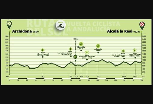 Segunda etapa: Archidona (Málaga) – Alcalá la Real (Jaén). 150,6 kilómetros. Jueves 17 de febrero. Un nuevo día con cinco puertos de montaña que terminará en la celebrada fortaleza de la Mota de Alcalá la Real que se adjudicó el año pasado Ethan Hayter.