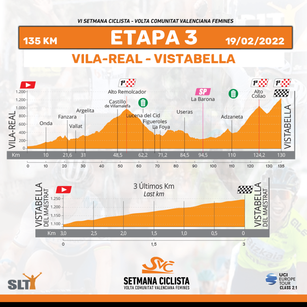 Los primeros kilómetros de la etapa discurrirán por la Plana Baixa, entre Vila-Real y Onda. A continuación, la carrera se adentrará en Fanzara, Vallat, Argelita y Castillo de Villamalefa, un terreno exigente en la comarca del Alt Millars que llevará a las ciclistas a coronar el alto Remolcador, de primera categoría, cuya cima estará ubicada en el kilómetro 52. A continuación, rápido descenso por Lucena del Cid, Figueroles y La Foya, en la comarca del Alcalatén. A partir de ahí las corredoras se dirigirán a Les Useres y La Barona, ya en la Plana Alta, donde estará situado el esprint especial de la jornada en el kilómetro 94.